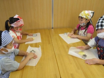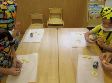 給食の先生から一人分の丸いクッキーの生地をもらって、両手で平らにしていろいろな型抜きで形をとりました。