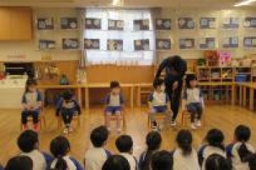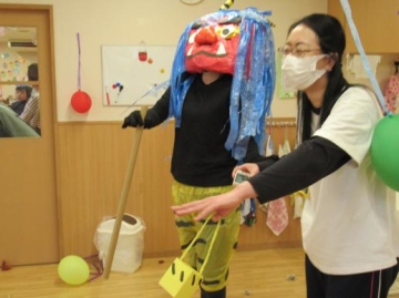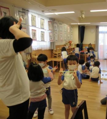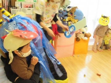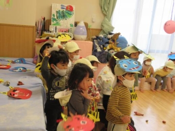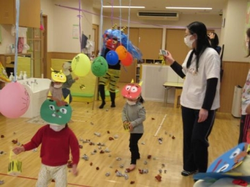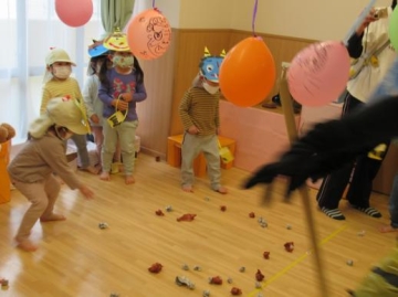 2歳児クラスは、鬼に連れていかれそうになり、戸惑っているみんな