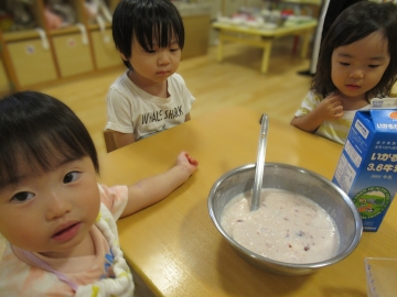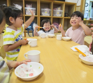 みんな興味津々😊 「おいしくな~れ‼️」とパワーをおくり混ぜている間にトロトロに変わると
