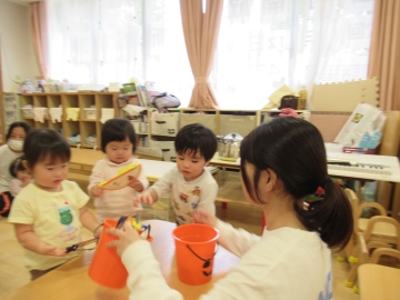 保育士による「ハロウィンハロウィン」の絵本やペープサートをみて最後に