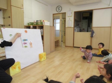 4月の誕生会ではパネルシアターを見たり自分達で作ったこいのぼりを
