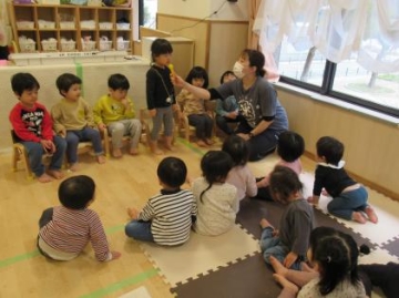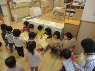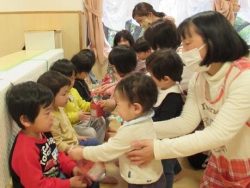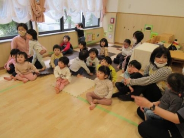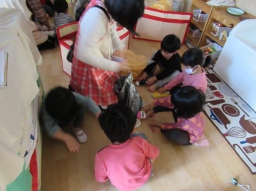 保育士からパネルシアターや手品、大型絵本などのプレゼントとぺんぎん組とらっこ組からは手作りプレゼントをもらって「ありがとう❤」とにっこり笑顔のいるか組の子ども達。
