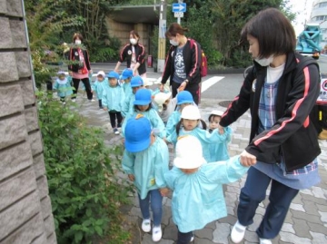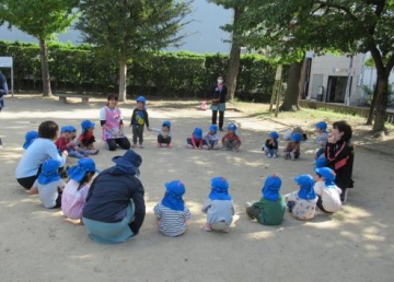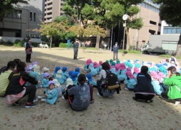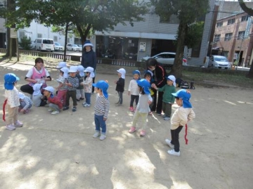 今日は新町第2保育園と合同での消防署立ち合いの避難訓練があり、玄関ホールで避難靴を履いて公園まで避難しました。