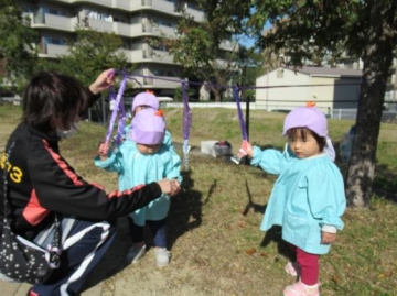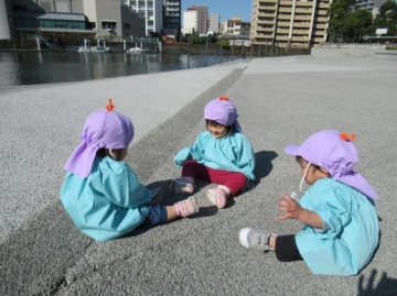 今日は新町第2保育園のあひる組と一緒に島津公園に出かけ、おやつ取りゲームやポットん遊び、しっぽ取りゲームを楽しみました。