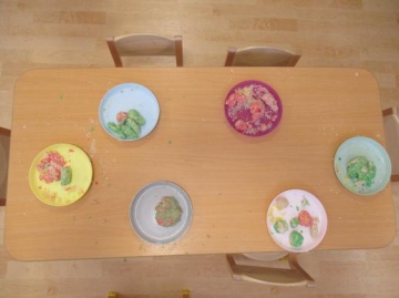 いるか組は食紅を使って色を付けに挑戦。色が混じる楽しさも味わっていました。