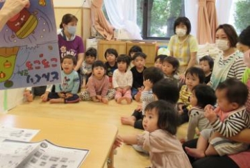その後、どんぐりころころの絵本(保育士お手製)、横開きではなく縦にめくっていくタイプで、下からドングリやドジョウが出てきていつもとは違った本を楽しみました。