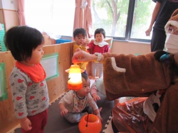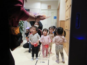 ちょっと怖がっていましたが、泣くことなくお菓子をもらい「ありがとう❤」と言っていた子どもたち。