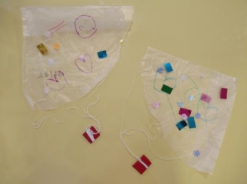 親子でパラシュートを作り、公園で飛ばして遊びました。凧あげのように持って走ったり、お父さんやお母さんに抱っこされて高いところから飛ばしたり・・・😊