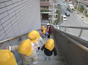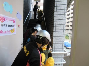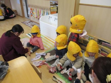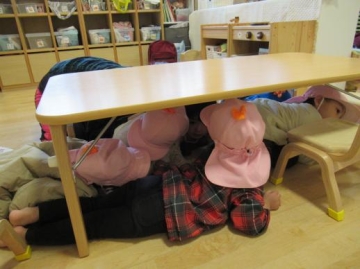 机の下に隠れて揺れが収まったら頭巾を被り避難靴を履きます。机の下に隠れるときはびっくりしていた子どももいましたが、頭巾を被る時には落ち着き3階まで避難することができました。