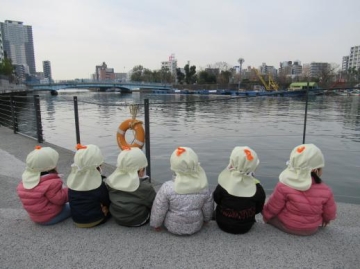 川で泳いでいる鴨を見つけると、手を叩いたり声を出して呼んでいた子ども達。