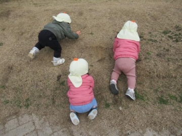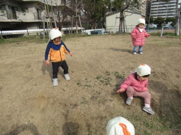 山になっている芝のところでは、こけそうになりながらも登ったり、尻もちをついて降りたりしていましたが、何度か繰り返し遊んでいるうちに、登りやすい場所や降りやすい場所を自分で見つけて、こけずにできるようになっていました。