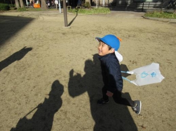 自分達で作った凧(ビニール袋にマジックでお絵かきをしました😊)を持って公園へ出かけたぺんぎん組の子ども達!
