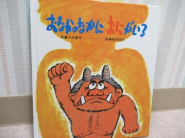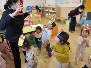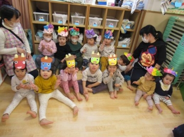 節分にちなんで、「おなかのなかにおにがいる」の絵本を見た後、かわいいおにの子ちゃんに変身です。