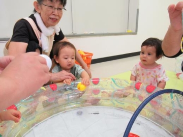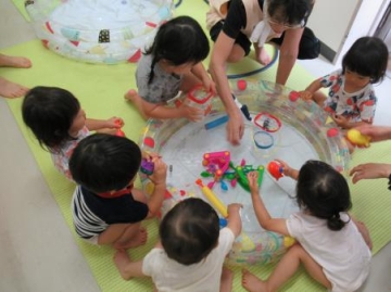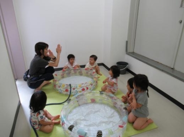 玄関ホールでビニールプールに水(お湯ですが)を少し入れてパチャパチャ水遊び。子ども達は大喜びで水をかけたりおもちゃに水を入れたり楽しみました。