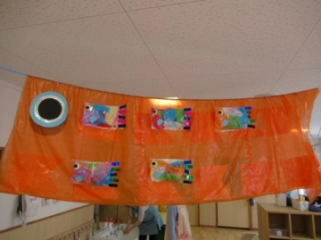 4月のお誕生日のお友だちのお祝いをした後、子ども達が作った素敵なこいのぼりを見ながら歌を歌いました。