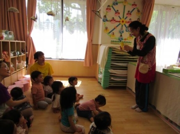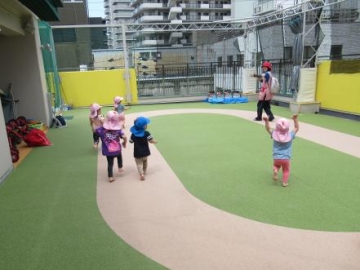 保育園生活にも慣れ、いろいろな遊びが楽しめるようになってきた子ども達。今日はヴィクトリア先生が来てくれ、英語に触れて体操や歌を歌って過ごしました。