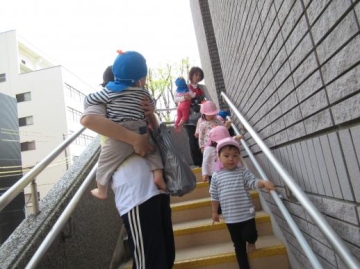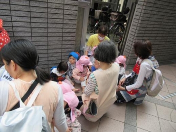 少しびっくりしていたお友だちもいましたが、保育者の話を聞いて一階玄関まで避難することが出来ました❕