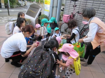 今までは二階の入り口までの避難でしたが、今回は裸足で一階まで避難。建物から離れて避難靴を履いて話を聞いて終了です。保育士の話をしっかり聞いて落ち着いて避難することが出来ました。