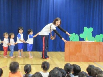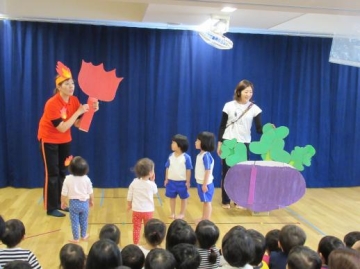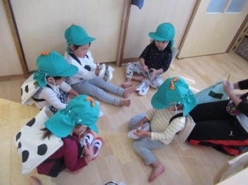 11月のお誕生児のお祝いの後は、お誕生児と保育士による「大きなおいも?!」のごっこ遊びををみんなで楽しみました。抜けた大きな芋は炎の精が出てきて焼き芋にしてくれ、みんなで美味しく食べました。そして、3時のおやつもスウィートポテトが!! (*´艸`*)