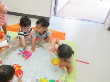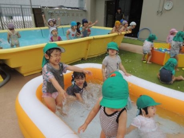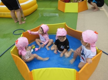 新町第3保育園の玄関ホールでは、小さなビニールプールでちゃぷちゃぷ💧