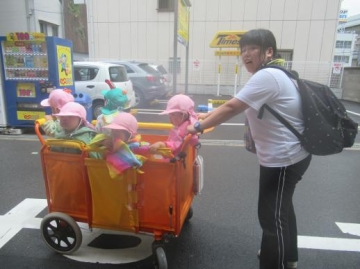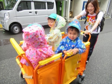 ☂天気が怪しかったので、カッパ(今風に言えばレインコート)を着て出発です。初めて着るカッパに泣くお友だちもいましたが、雨にあたることもなく往復することができました(*^-^*)